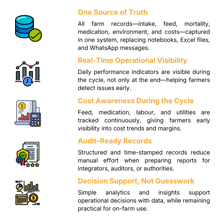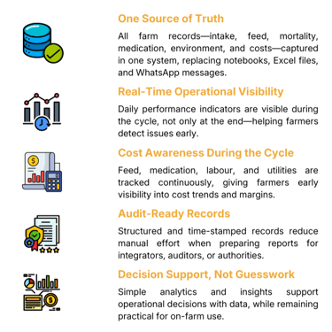 Farmers spend on feed, chicks, medicine, electricity, and labour every day, but usually only know the total cost after the cycle ends, when it is already too late to adjust.