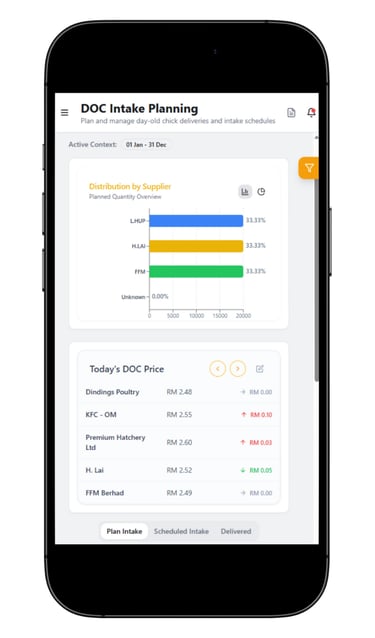 Helps farmers plan what is needed before and during a production cycle, such as feed, DOC, medication, and supplies. It reduces last-minute purchases and helps control costs by knowing what to buy and when.